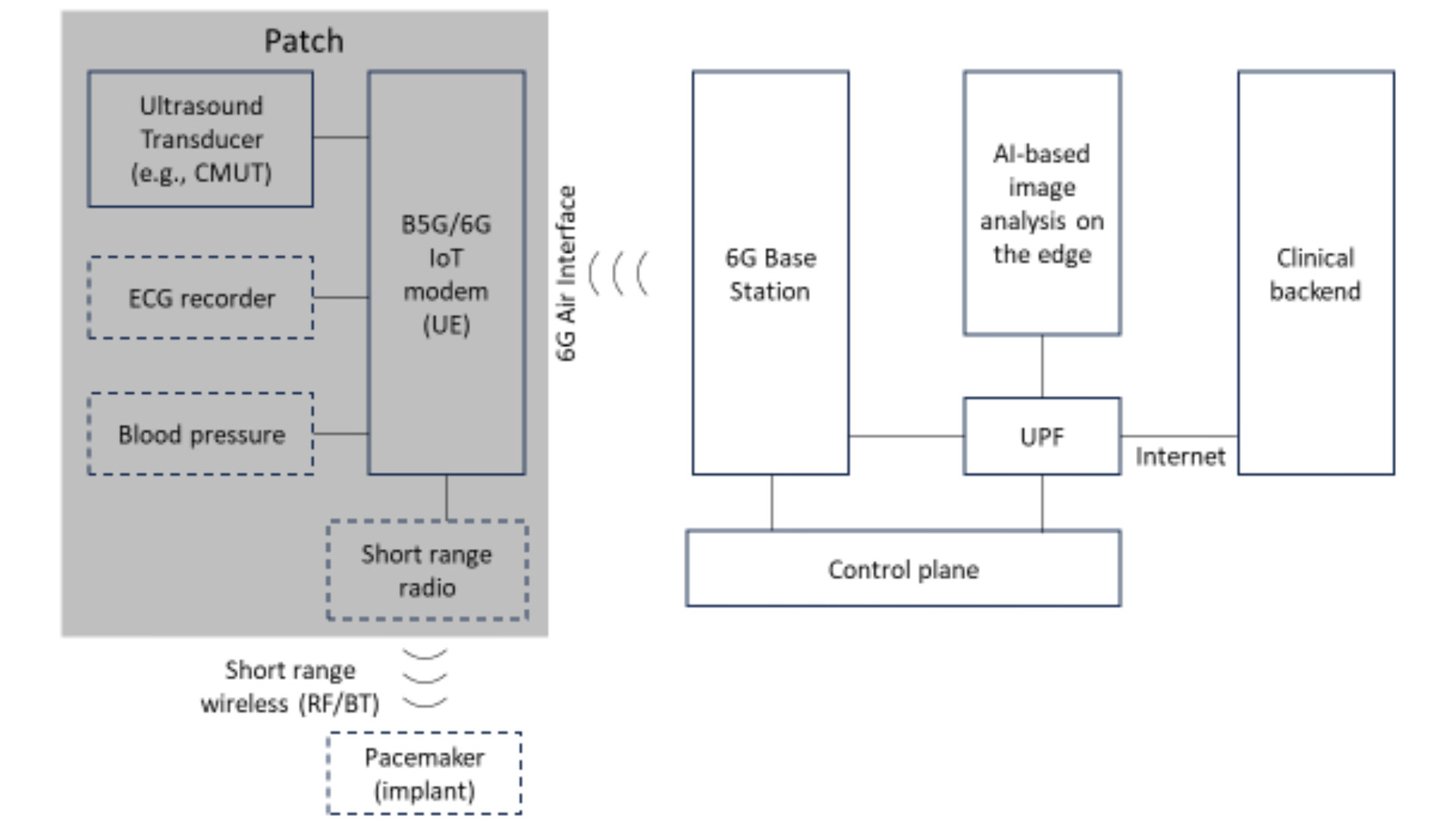 The patch obtains EGM data from the PM/ICD via RFID and subsequently transmits it via the 6G network to the edge. The edge may send back reprogramming instructions via the same path. All of this has the occur – literally – within a heartbeat. Specifically, a data packet may be sent every heartbeat and it needs to arrive at the edge within 10 milliseconds to be in time for reprogramming the pacemaker before the next heartbeat. The use of RFID (backscatter) communication allows all reading and writing from/to the PM/ICD to be powered by the patch, rather than by the battery of the pacemaker, safeguarding its lifetime. The AI-based assessments are also communicated to the cardiologist via the Clinical backend which is connected to the 6G-System via a Data Network such as the Internet.