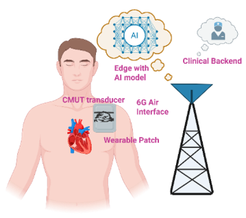 The use case focuses on novel ways to perform cardiac ultrasound assessment, an indispensable tool for the diagnosis, intervention and follow-up of heart patients. New adhesive-patch-based, ultrasound devices, leveraging Capacitive Micromachined Ultrasonic Transducer (CMUT) and similar transducer technologies, are appearing on the market. These patches can be semi-permanently attached to the patient’s body enabling more frequent assessments and monitoring for longer time periods. Patch-based, cardiac ultrasound assessment can be automated by deploying AI-based, ultrasound image analysis algorithms on the edge. These algorithms will extract cardiac function parameters, such as ejection fraction. Furthermore, hemodynamic (e.g., blood pressure) and ECG data can be integrated into analyses for addressing different clinical situations. The cardiac assessment solution comprises a 6G-enabled, ultrasound patch (ECG and blood pressure sensing are optional) and the 6G system hosting AI-based image analysis on the edge. The AI-based assessments are communicated to the cardiologist via the Clinical backend which is connected to the 6G System via a Data Network such as the Internet.